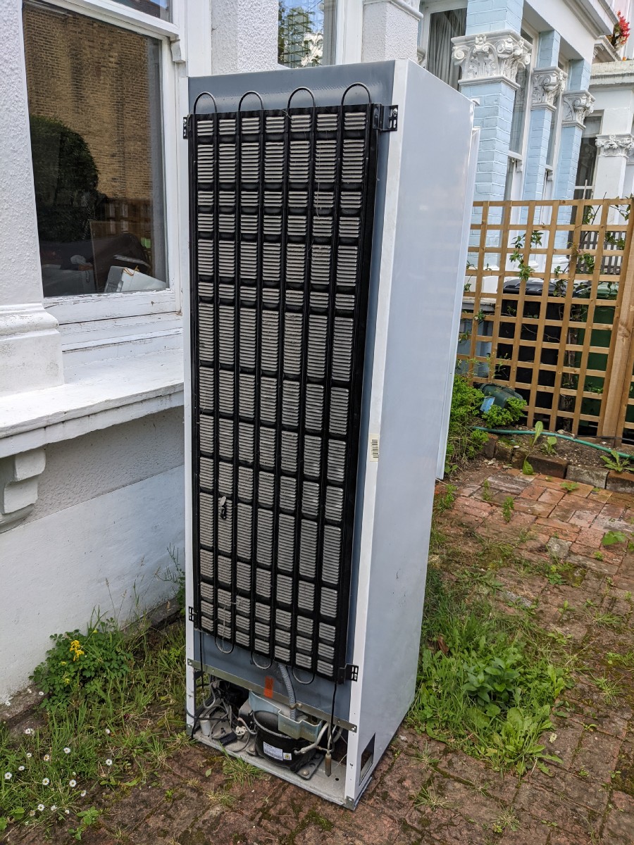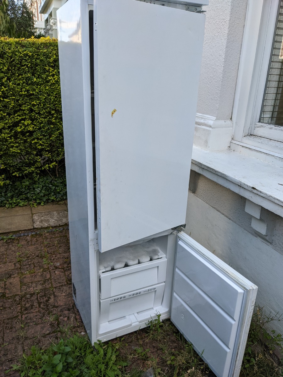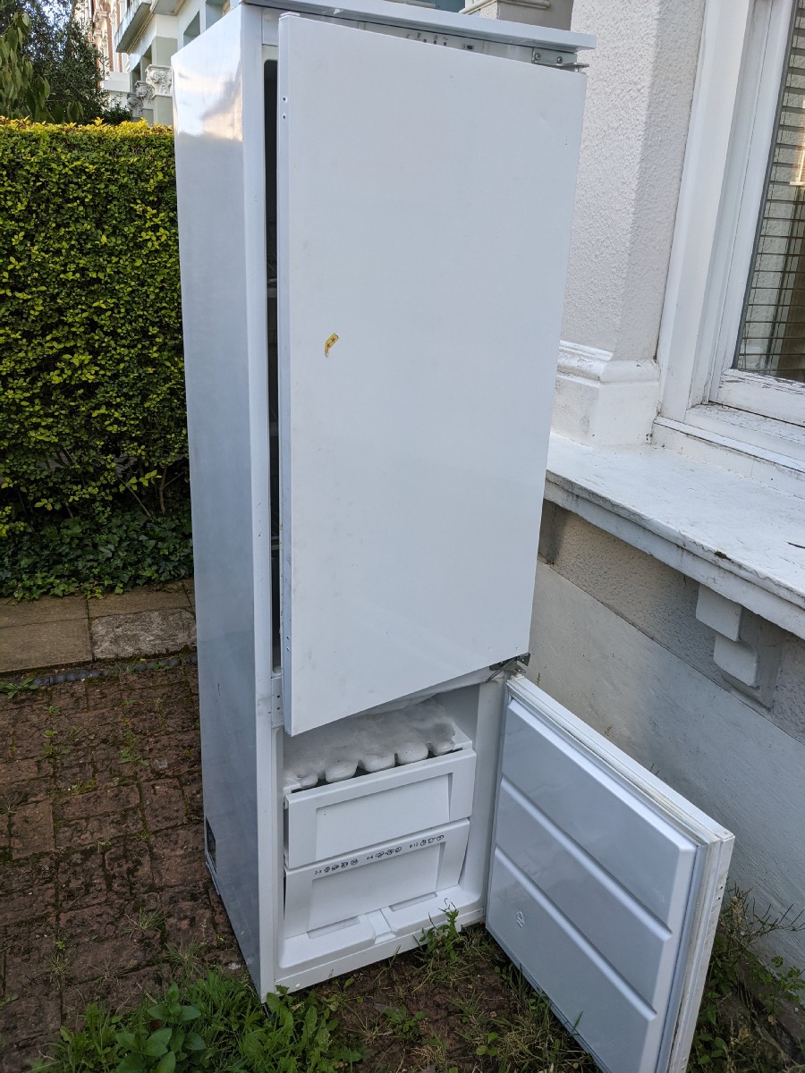 11:06:23 I had to improvise to make a coffee in the morning as the electrical works were still ongoing. | 12:45:59 I managed to get the old fridge freezer out into the front garden all by myself, that felt like an achievement. | 13:48:04 Macaroni cheese for lunch, in part because I had some milk and cheese to use up and no fridge. | 14:29:18 The old fridge freezer, defrosting out in the front garden. |