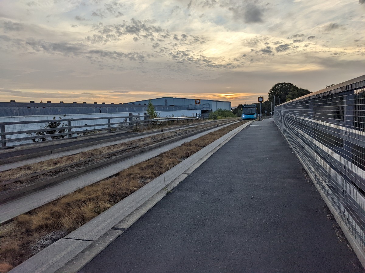 05:21:52 Packed up and on my way now. | 05:35:03 I think this is the point where I parted from the Icknield Way, and headed for a slightly surreal early morning walk through Dunstable and Luton. | 05:43:26 At the most dramatic moment of the sunrise I was walking through this somewhat uninspiring part of Dunstable. Should have stayed on the hill a bit longer! | 06:24:21 Decided to follow the "Guided Busway" to Luton station, which had a cycle path beside it, and was therefore presumably also pedestrian friendly. |