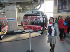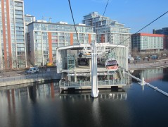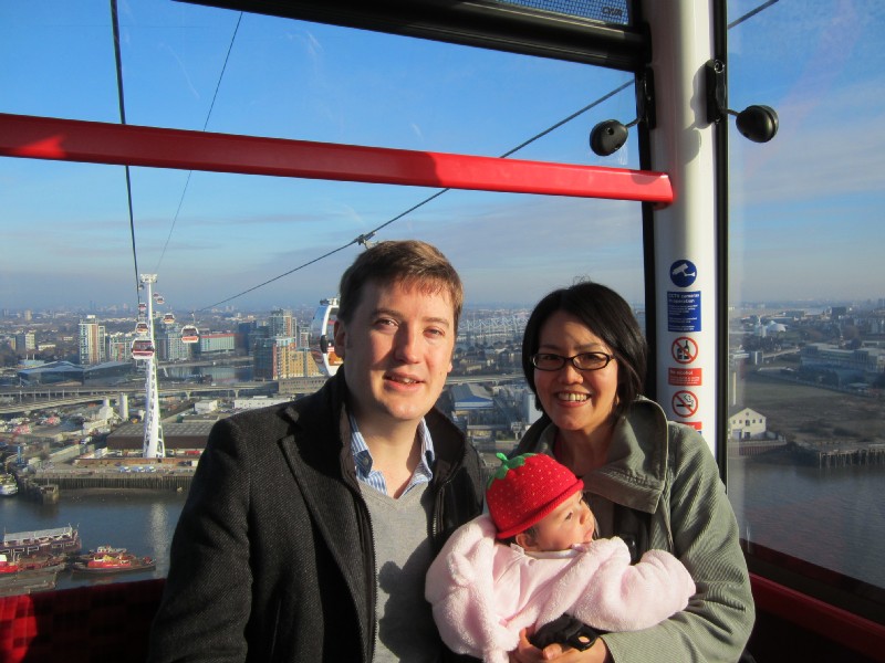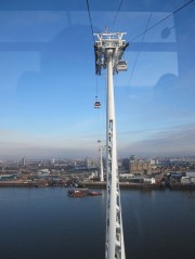 11:39:08 A picture of the three of us kindly taken by the people we were sharing the cable car with. | 11:39:52 The North side of the Thames. | 11:40:00 Nice sky today. | 11:42:35 The Millenium Dome as seen from the cable car. |