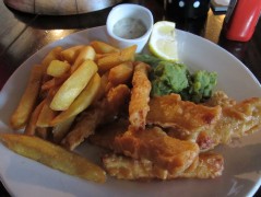 12:58:40 The view of the Thames from just outside where we were sitting. | 13:17:41 Me, Erika and our pub lunches. | 13:18:32 My vegetarian fish and chips. | 13:27:39 Me and Erika. |