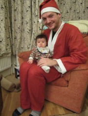 15:36:18 The theme was "winter kitsch" so I had bought this profoundly horrible fleece for it. | 19:09:39 On the way to the party. | 20:39:40 Al dressed as santa, so a picture with Erika on his knee seemed almost mandatory. | 20:40:02 ...and we also managed to find a beard. |