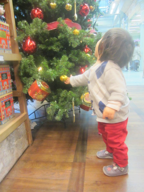 14:48:27 Erika playing with the baubles on the Christmas tree at the Fortnum and Mason in St. Pancras. | 14:48:32 Cheeky face! |