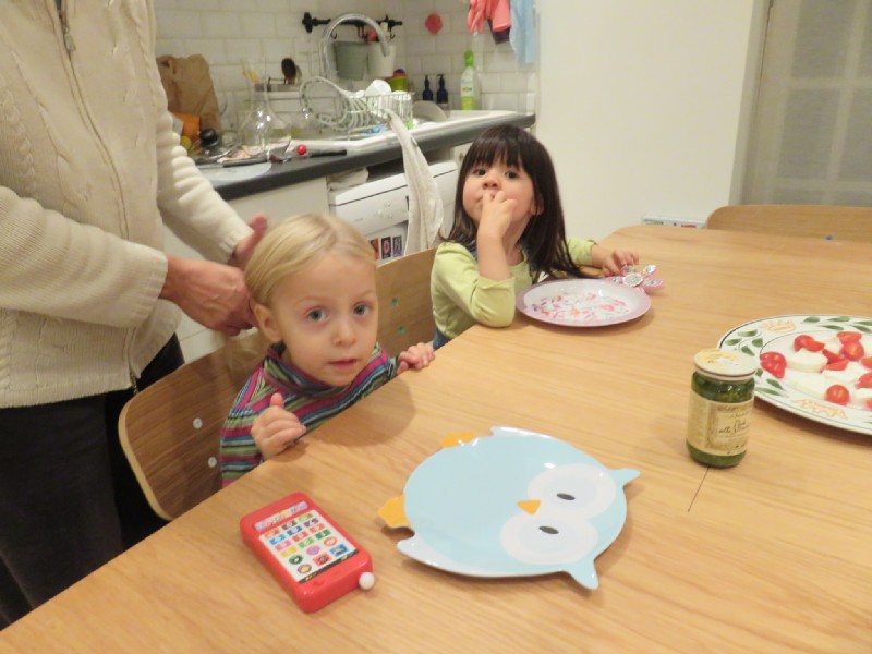 13:44:41 Erika having a little tea party with some of her toys while we waited for our guests to arrive. | 20:02:45 After everyone else had left a friend of Erika's popped round for dinner. |