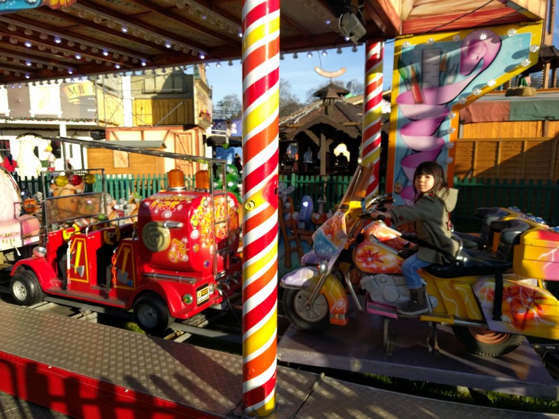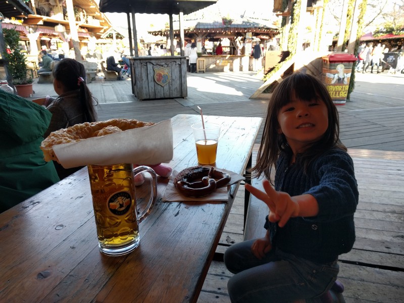 10:49:34 Another ride, this time planes rather than carriages. | 11:30:03 Yet another ride. | 11:34:46 Erika cried all the way round on this ride because she didn't like her choice of vehicle. | 12:09:09 Very unhealthy lunch - beer (apple juice for Erika) and pretzels. Terrible parenting though it may have been this was my favourite bit of the day. |