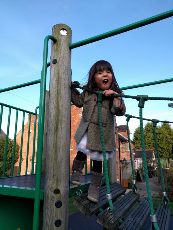 10:43:48 Erika on the train on the way there with her little toy sushi set. | 13:40:26 On the playground of the pub where we went for lunch after arriving. | 13:45:13 Erika and Grandma running around in the little playground. | 17:26:41 The English wine Mum had got, made locally, and quite drinkable. |