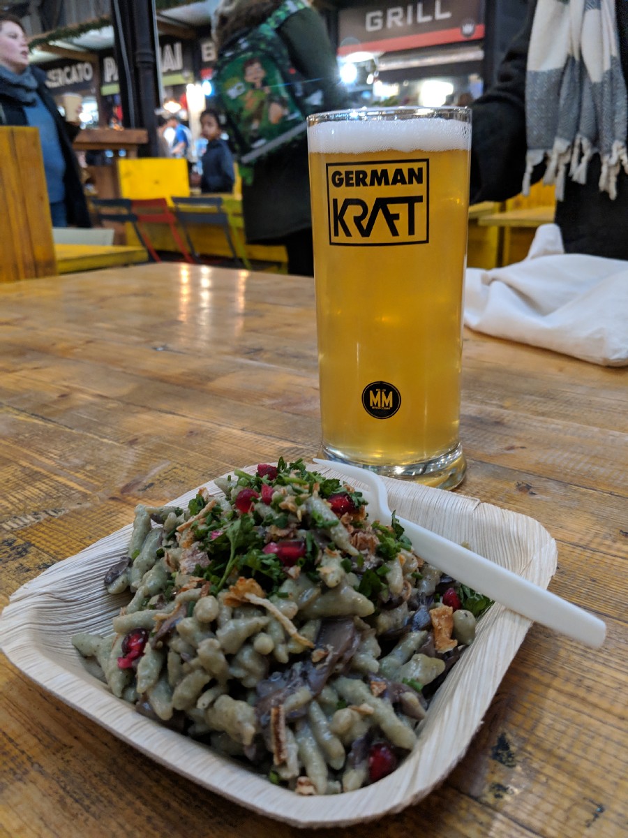 10:36:00 Our Christmas Tree, not yet decorated. | 12:39:20 Mercato Metropolitano, where we had lunch. | 12:45:47 My spaetzle. It was quite nice but didn't really make a complete meal by itself. | 12:47:04 Erika and her friend with their pizza, which looked good. |