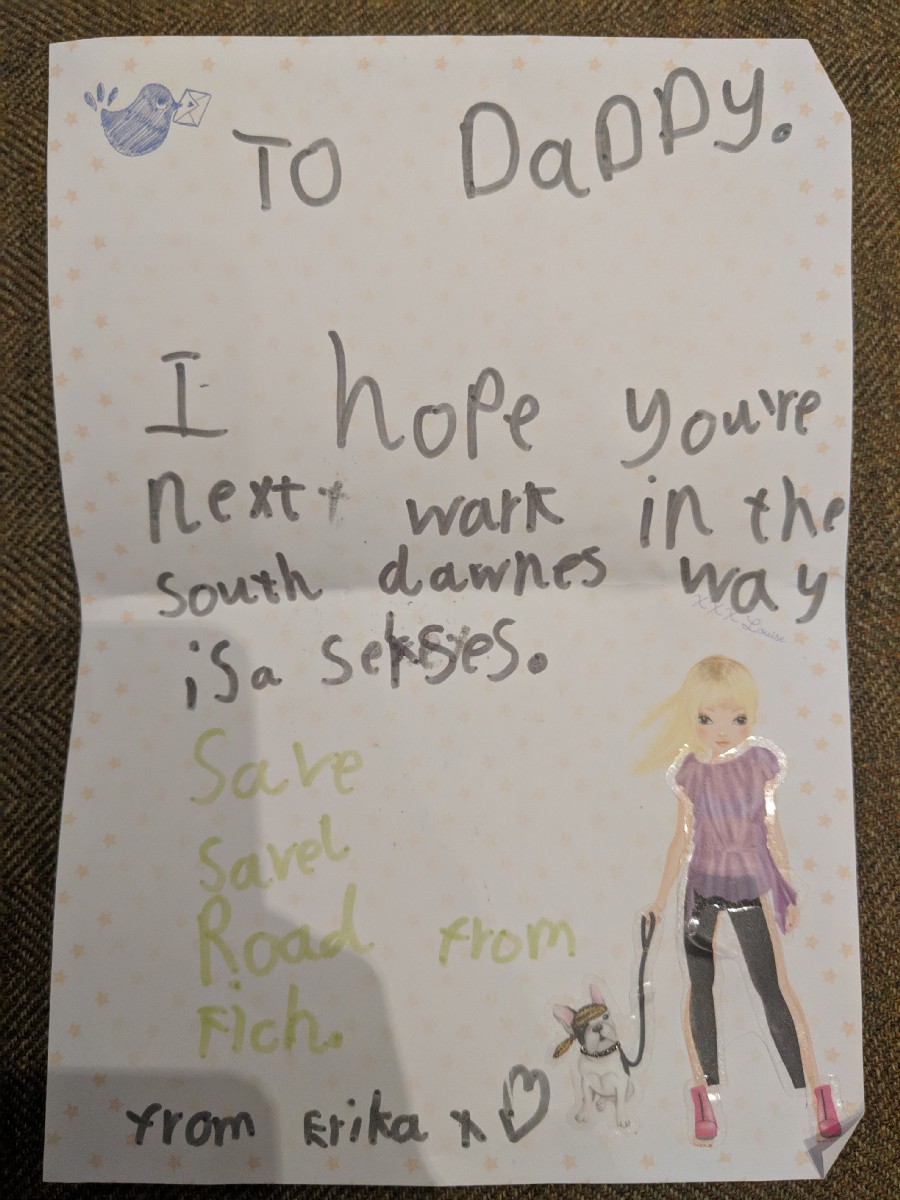 To Daddy, I hope your next walk in the South Downs Way is a success. Save Savile Row from (Abercrombie and) Fitch). From Erika x | 12:16:32 Chie and Erika on the tube. | 12:48:07 Me and Erika in Shikumen. | 12:48:16 |