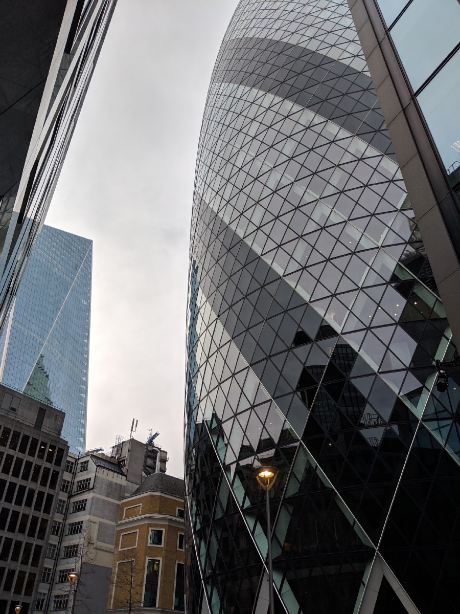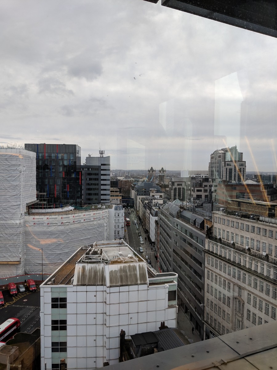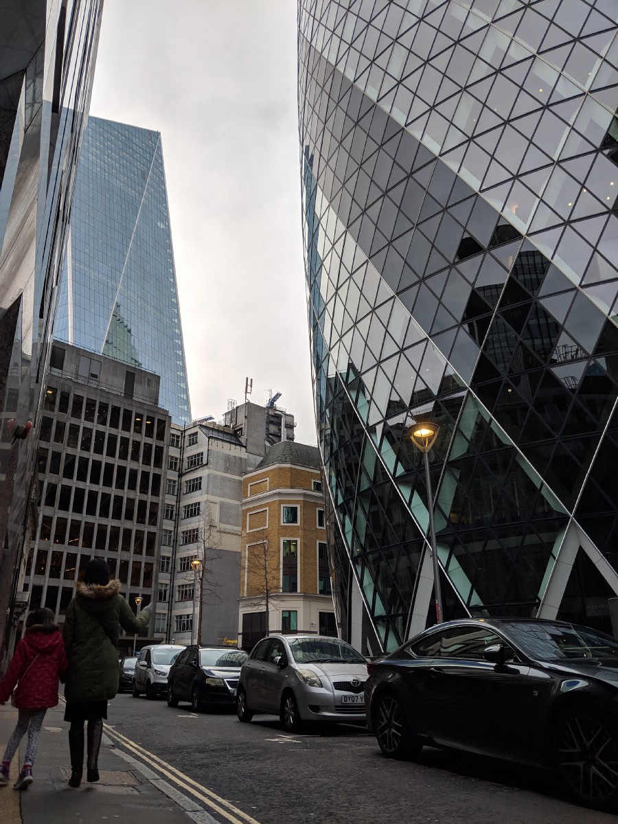 13:20:02 | 13:34:37 The view from the top floor of the hotel Shikumen is in. | 13:34:46 | 13:44:01 Taking a wander through the City now - Erika had been learning about the London skyline at school so we thought it would be nice to see some buildings like the Gherkin up close. |