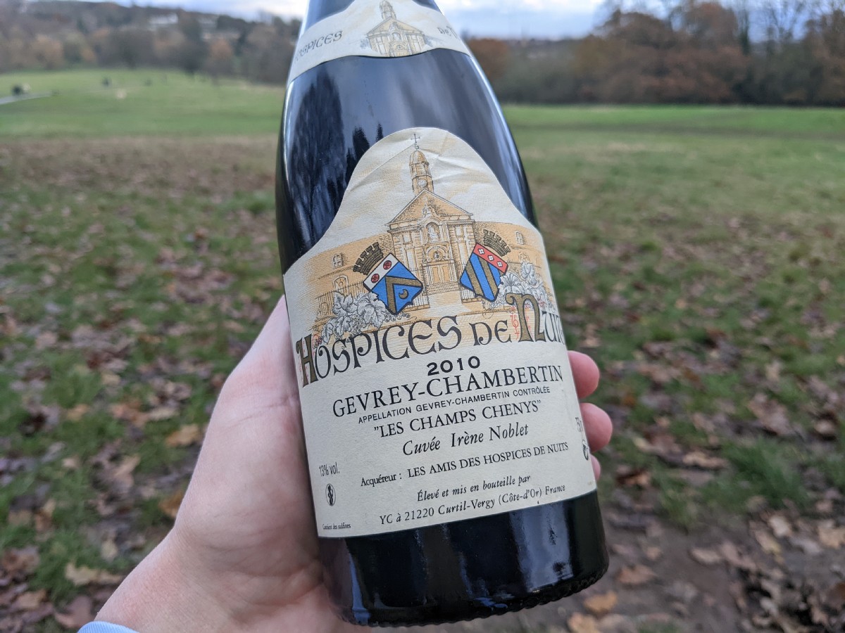 14:39:17 The view of the bandstand on the way onto the heath. | 14:42:21 The top of Parliament Hill. | 14:49:39 The view down towards Highgate. | 14:51:25 Hospices de Nuits Gevrey Chambertin 2010. Slightly muted on the nose, but very pleasant on the palate. |