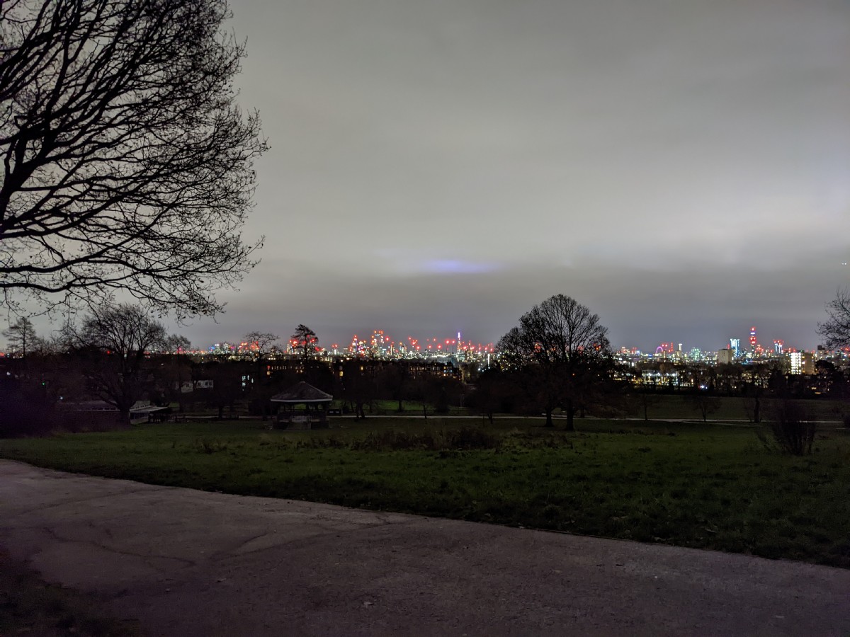 19:46:43 Night Sight shot of the tree. | 20:25:45 The top of Parliament Hill. | 20:34:56 The view of the bandstand as I was leaving the heath. | 20:55:37 A cat rummaging through soem rubbish on the way home. |