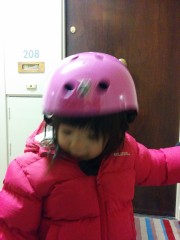 Erika in her helmet with the scooter. Not sure why she's lying on the floor here.