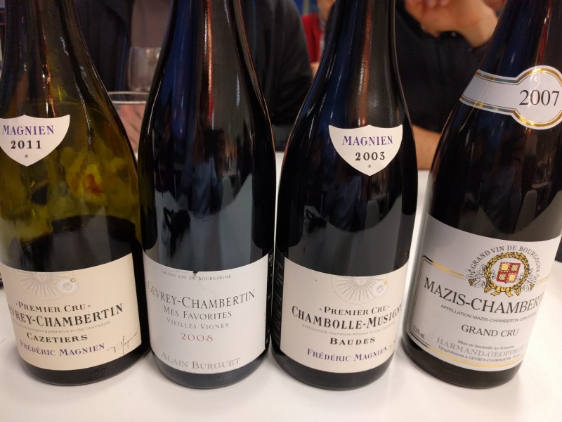 17:39:10 The wines I chose for the wine tasting - Frederic Magien Gevery Chamertin Cazetiers 2011, Alain Burguet Gevrey Chamertin Mes Favorites Vielles Vignes 2008, Frederic Magnic Chambolle Misigny Baudes 2004 and Harmand Geoffrey Mazis Chambertin 2007. | 18:26:25 Alas one was corked! |