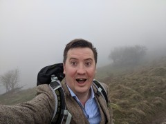 11:17:44 Another selfie, partly to note my wet hair as a result of the perpetual mist. | 11:37:10 The trig point at the Beacon Hill I passed after leaving Exton. | 11:57:16 An interesting South Downs Way sign with drinking water tap attached. | 12:10:57 More snowdrops. |