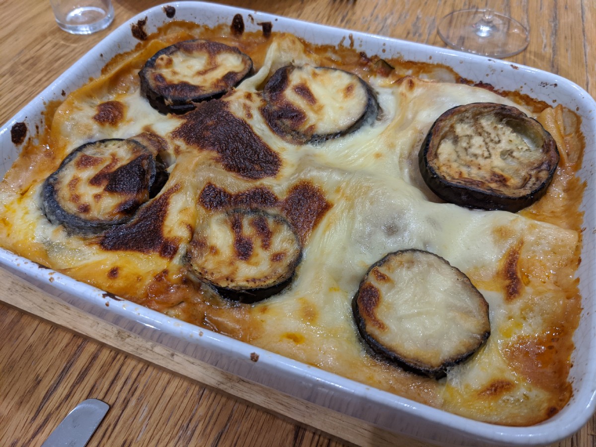 18:25:01 I thought I'd re-attempt the East Meon Berrygarden 2014 this evening - the first one had been a bit faulty, but this one was I believe in the condition it was intended to be - honeyed pastry on the nose and a dry, low dosage palate. | 18:26:55 My creation for tonights dinner - somewhere between a lasagne and a moussaka (we had an aubergine in the fridge which needed using up). | 18:42:26 Enjoying the East Meon 2014. |