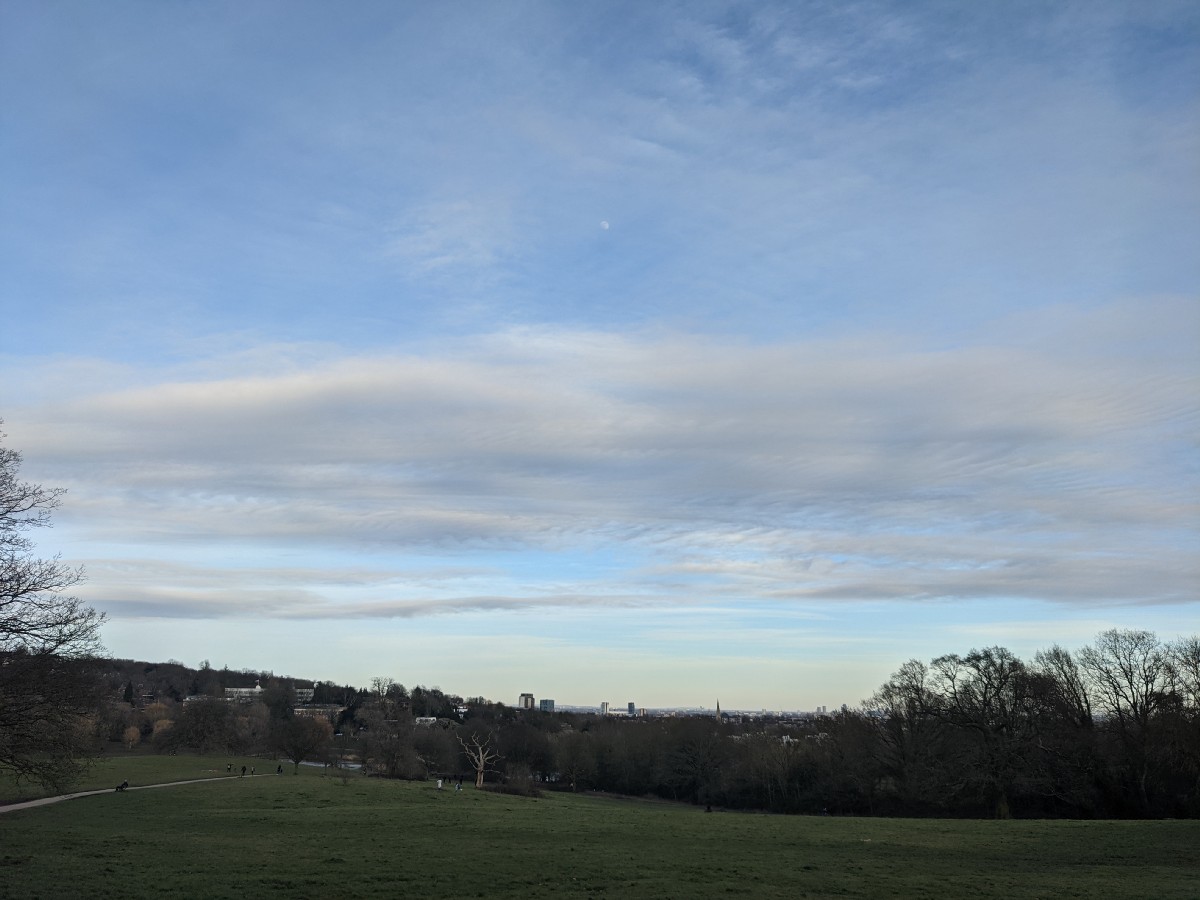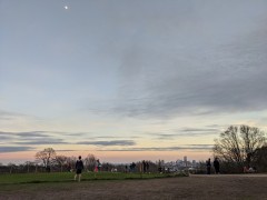 17:02:03 The moon again. | 17:04:12 A walk through the trees. | 17:08:14 Atop Parliament Hill. | 17:08:48 The view from the top of Parliament Hill of the London skyline. |