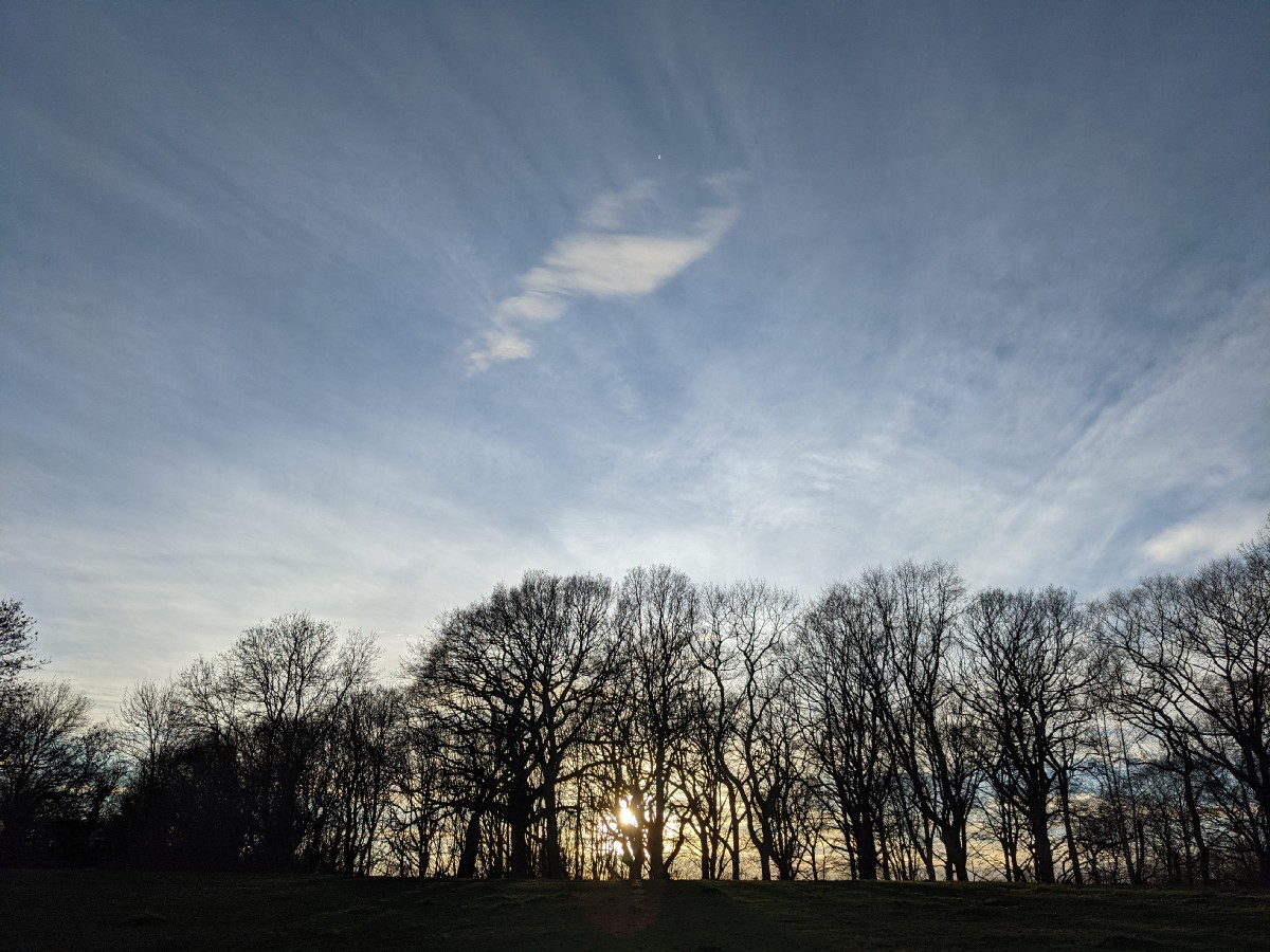 16:15:47 The moon visible in the daylight. | 16:17:13 The view from the barrow again. | 16:20:17 Looking through the barrow to the setting sun. | 16:35:17 The sun setting through the trees. |