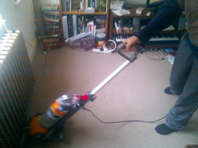 | 11:07:03 Our new vaccuum cleaner! Finally succumbed to getting a Dyson. | 12:50:07 Just look at all that dust etc! This is just from the floor in our lounge. | 12:52:14 Chie in action. |