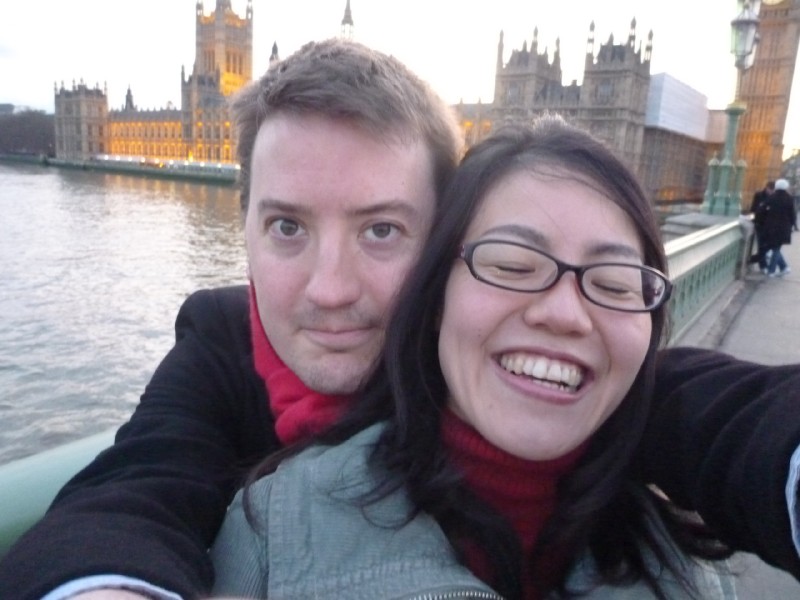 | 16:48:34 ...and there's the big show off. I suppose you do have to admit the clock is a rather nice touch. | 16:51:00 One corner of the Houses of Parliament, and it really looks like Big Ben (OK, St. Stephen's Tower if you absolutely must) is falling down. | 16:52:23 Me and Chie on Westminster Bridge with the Houses of Parliament behind us. |