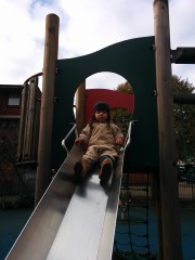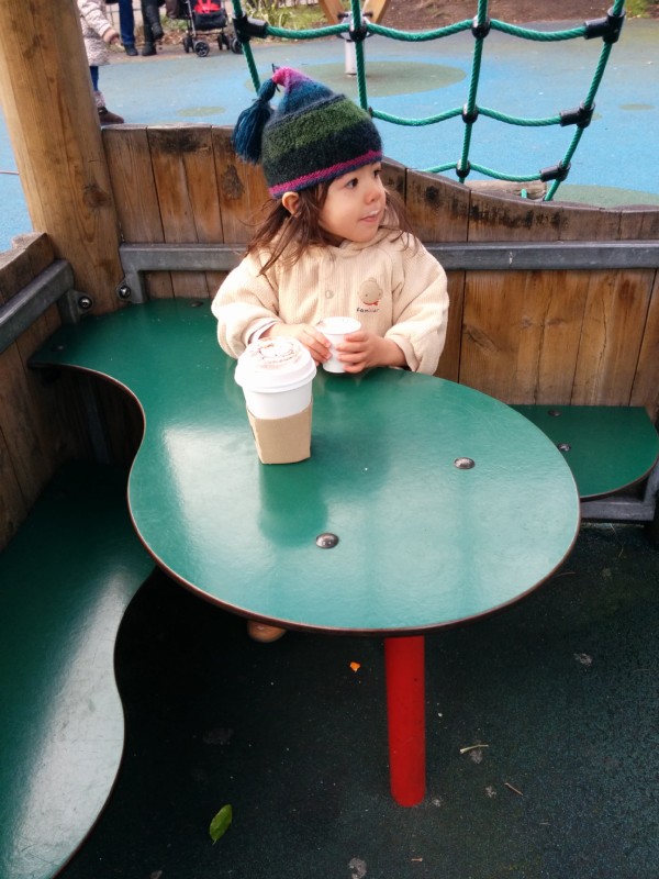 10:30:16 On previous visits to the playground Erika liked to pretend this little seating area was her cafe, so on this visit we actually took coffees along. | 10:30:22 Erika with her Babycino. | 10:50:41 Erika on the slide. | 12:36:20 Erika having a teddy bear picnic back at home. |