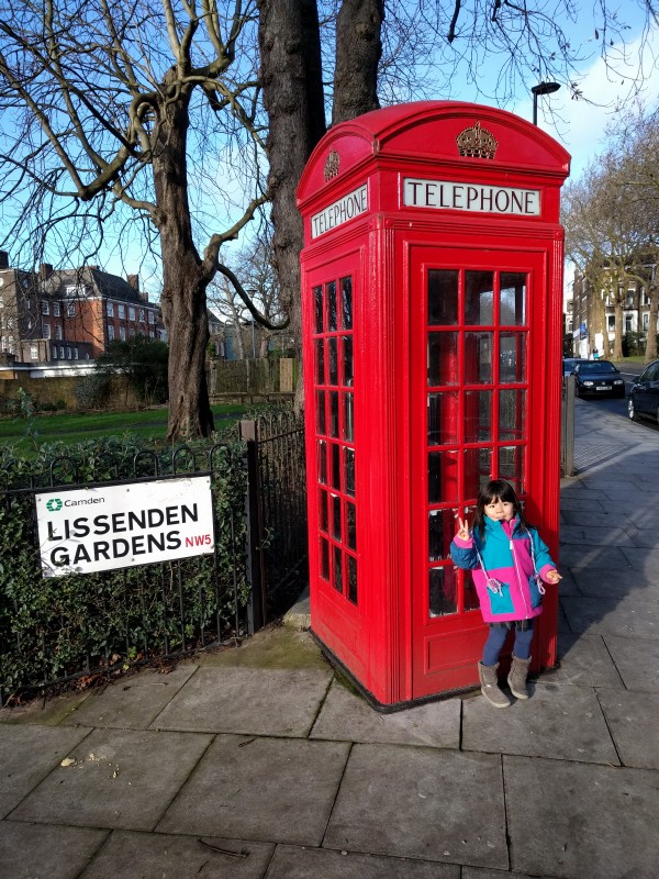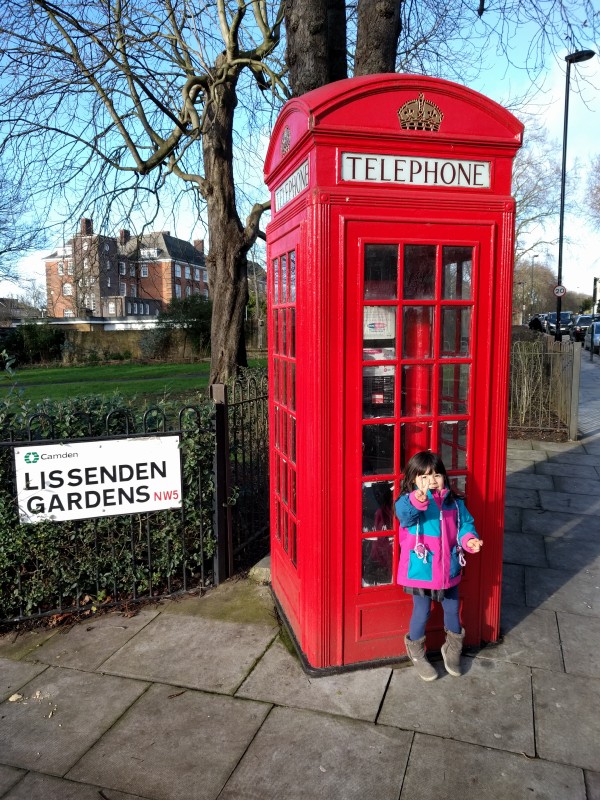 11:09:33 The pleasant little back lane we walk down to get to Hampstead Heath, one of the nicer little corners of Kentish Town. | 11:19:42 A telephone box en route which seemed a good place to stop for photos. | 11:19:45 | 11:20:05 Erika being very Japanese. |