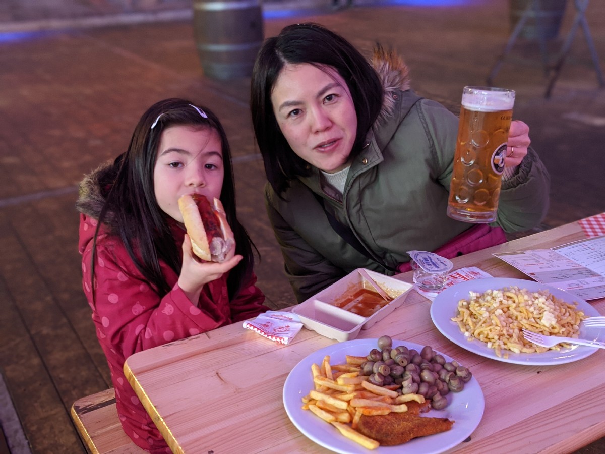 13:10:05 An incredibly beige lunch. The spaetzle weren't bad, but the vegetarian schnitzel thing was very naff, and I didn't really want or need the mandatory two sides it came with. | 13:10:16 Chie and Erika with our extremely beige lunch. | 13:10:26 The three of us at lunch. | 13:47:54 Erika took this picture of me and Chie with a gingerbread man. |