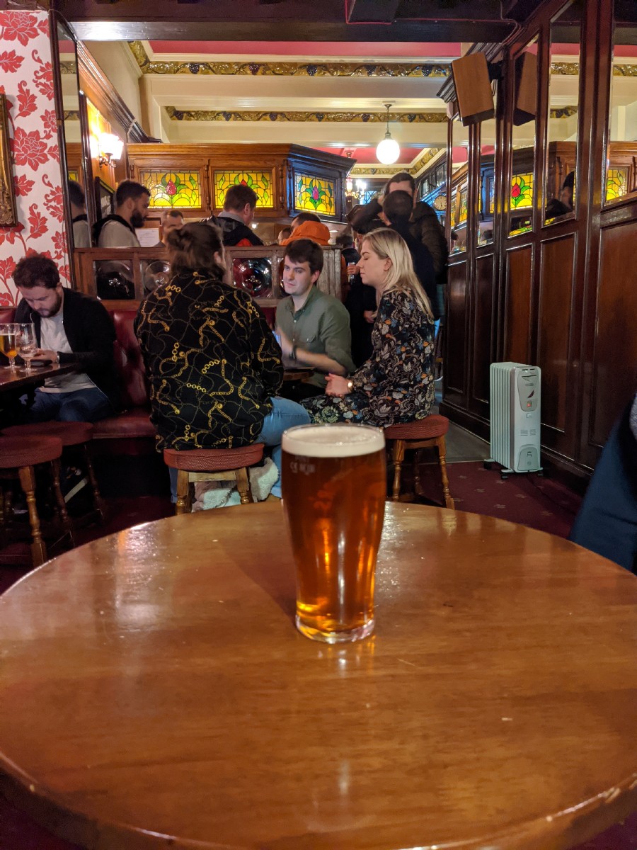14:51:43 Chie bought these half bottles of Nyetimber for practically nothing in the sale: £10 each, and also used a £15 John Lewis voucher so they effectively cost £2.50 each. | 17:06:40 On my way out I thought the moon looked nice. | 17:31:09 Managed to secure a table in the Wheatsheaf where I waited for the others to arrive. | 17:50:48 Ricardo observed some years ago that I bear a passing resemblance to Brendan Behan, which prompted this Christmas present. |