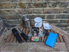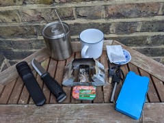10:46:20 Equipment for making a cup of tea out in the garden. | 10:46:38 The knife was for striking the ferrocerium rod, although in practice the little striking plate which came with it was easier to use for this. | 10:53:48 Camp stove setup. | 10:58:18 Practicing feather sticking again. |