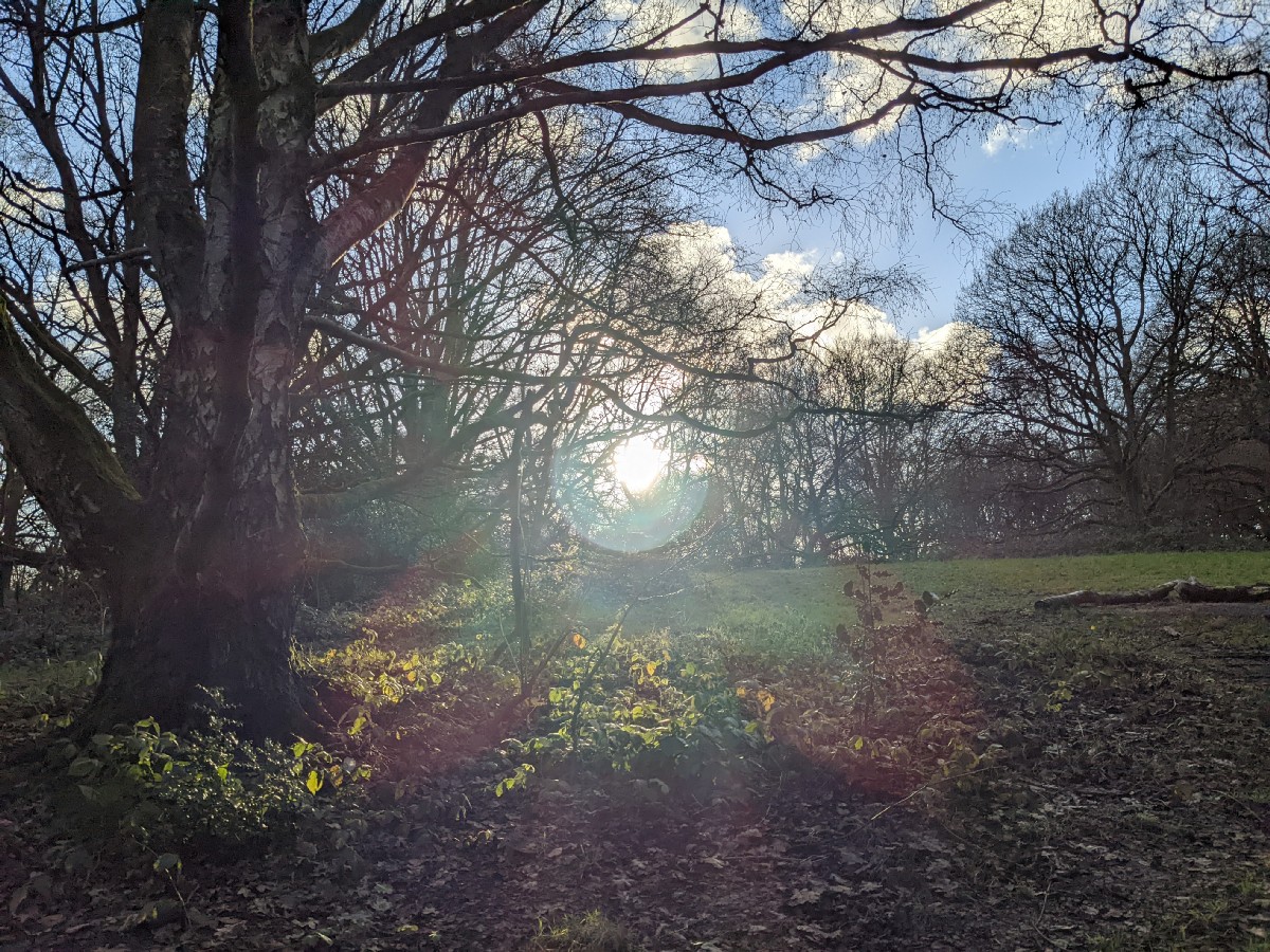 13:42:45 Nice weather on the heath this afternoon. | 13:42:51 Sun shining through the trees. | 13:46:34 | 13:46:42 Ice on the ground though. |