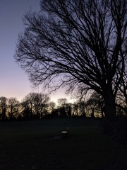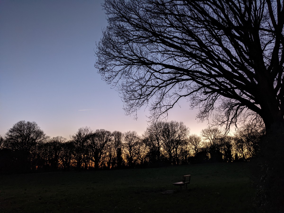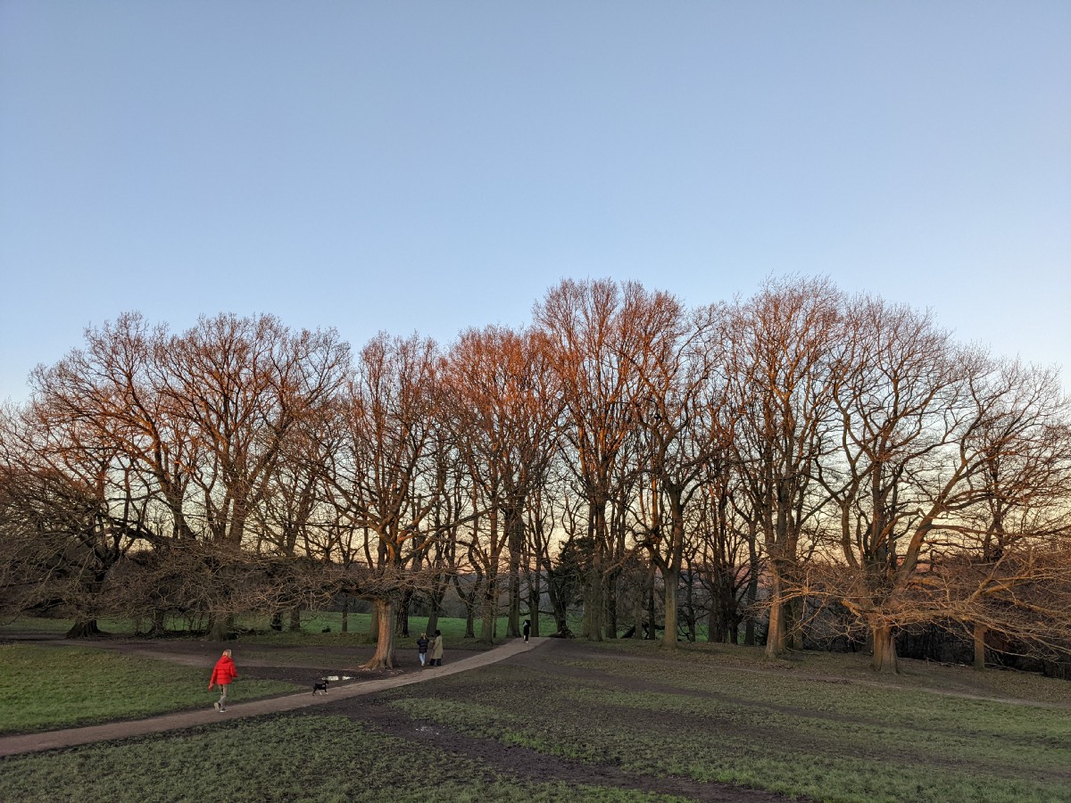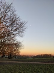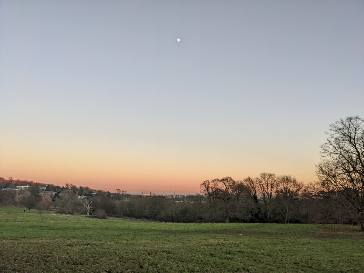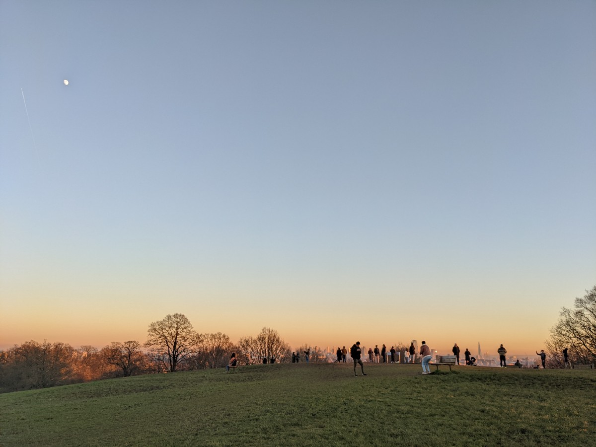 15:56:59 On arrival on the heath, with the sun setting somewhere over Hampstead. | 15:57:40 This tree on the way up Parliament Hill often makes a nice framing for the setting sun. | 15:58:02 Nice pink hints in the sky, and the London skyline beyond the bandstand. | 16:01:46 Lots of people milling about atop Parliament Hill today. |
