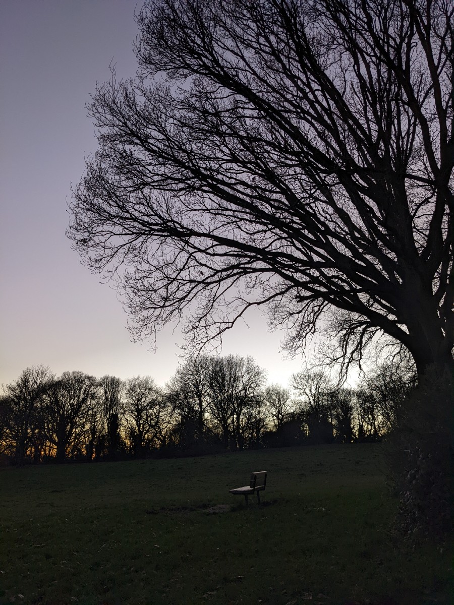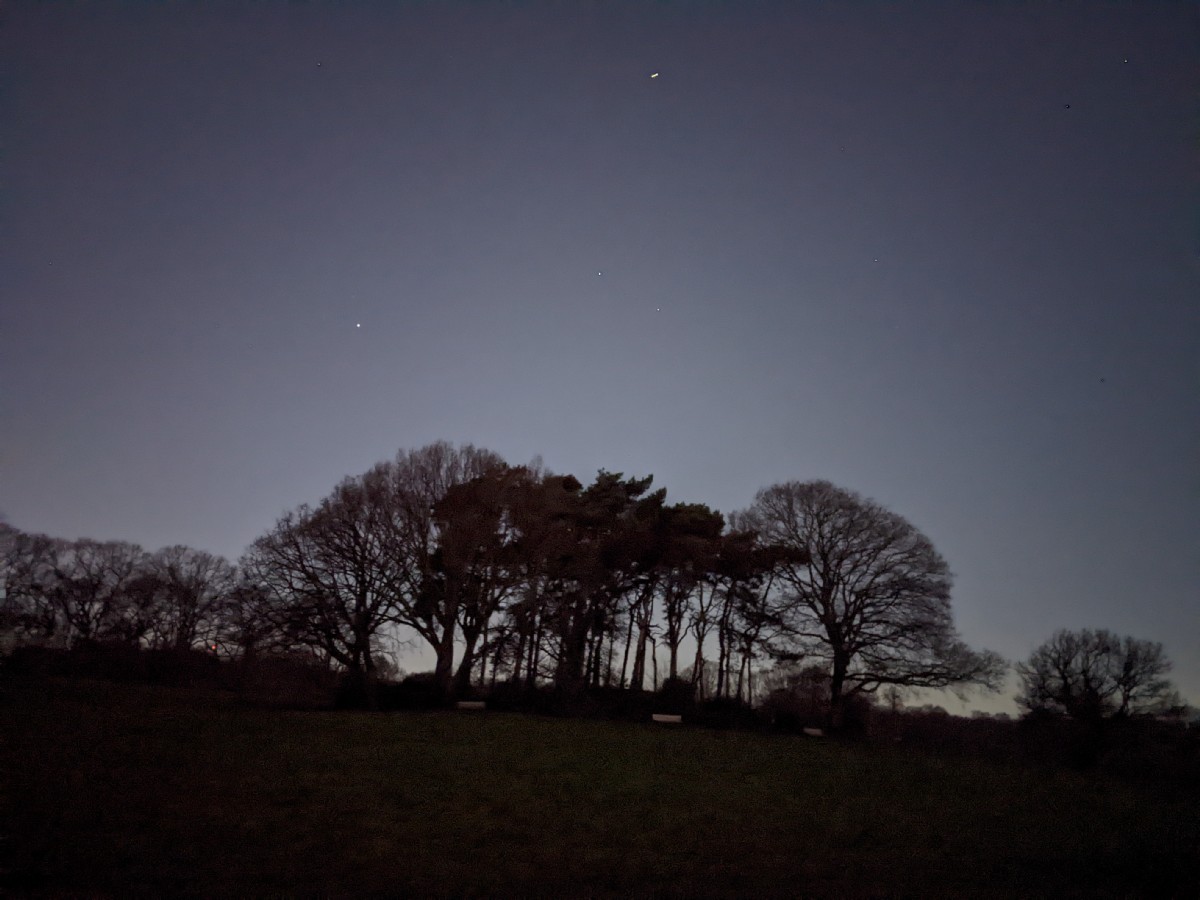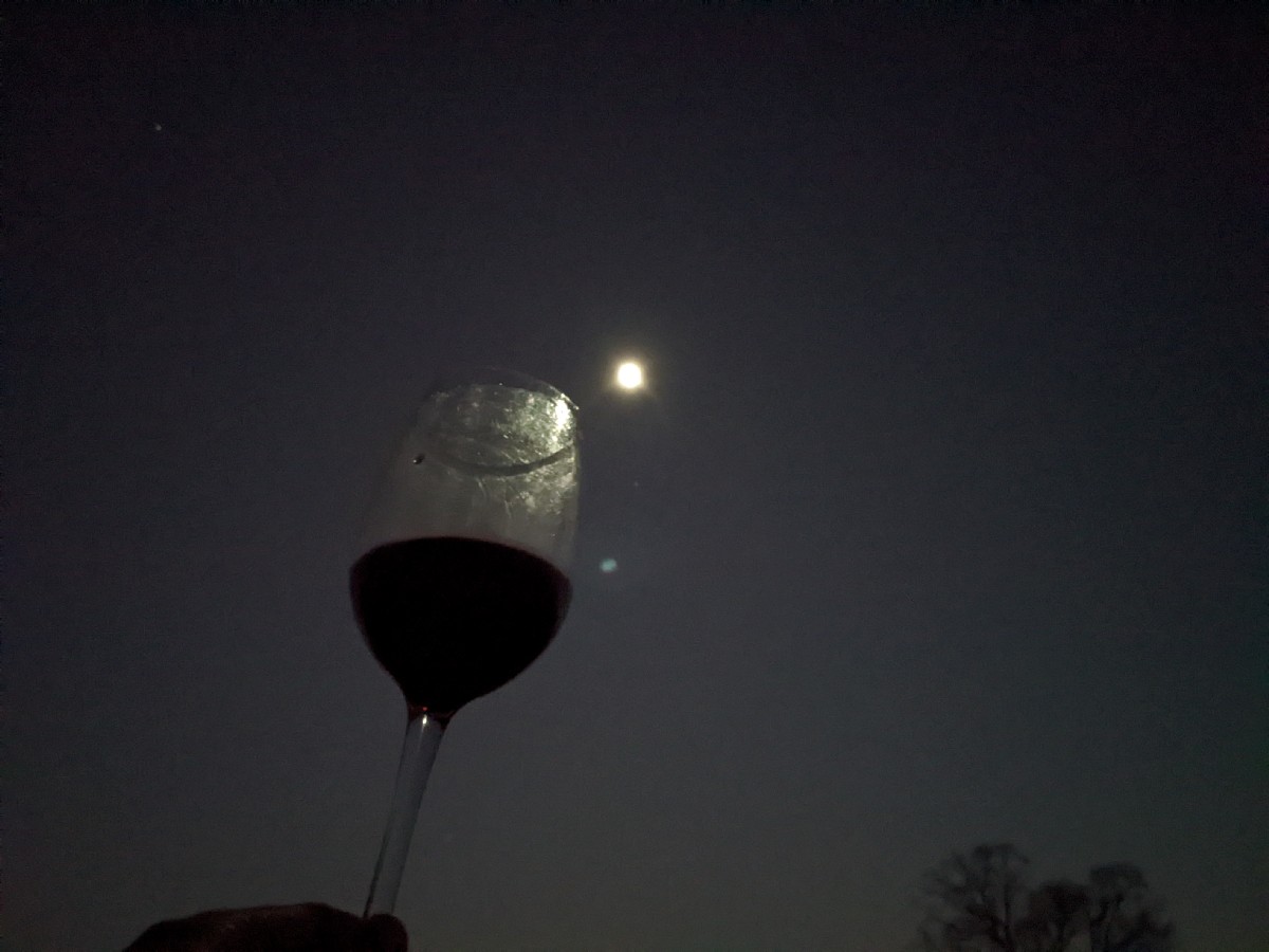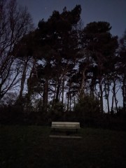17:04:53 Dark now. | 17:20:34 Raising a glass to the moon. | 17:26:05 Attempt to take a Night Sight photo - and you can actually see a handful of stars there. Lens flare from the moon is interesting as well. | 17:40:34 Another Night Sight shot of my favourite bench by the barrow. |