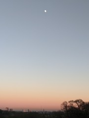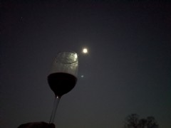 16:09:50 Brought along some of BBR's Nuits St Georges today, of which I wrote: "Abundance of fresh cherry on the nose. Palate alas has some untamed edges: needs more time. Tis but a baby." | 16:12:47 The view from the barrow again. | 16:13:01 Portrait orientation to try and emphasize the moon a bit. | 16:18:27 Of course attempts to get photos of the moon from a smart phone camera are always disappointing. |