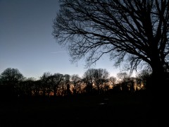 16:02:26 Settling down to watch the rest of the sunset. | 16:02:35 Official sunset time today was apparently 16:18, so it technically isn't fully there yet - but given the obstructions to the view of the horizon this was more or less the last glimpse of the sun. | 16:03:26 Nice light on the trees across from the top of Parliament Hill. | 16:04:16 Lovely pink tones. |