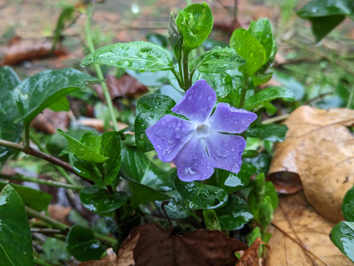 11:00:25 Bye bye Christmas tree! | 11:04:43 Periwinkle flowering in the front garden. | 11:19:45 The Christmas tree at the recycling place - for a change ours was one of the first! | 15:06:27 A pint of some kind of stout at the Pineapple. |