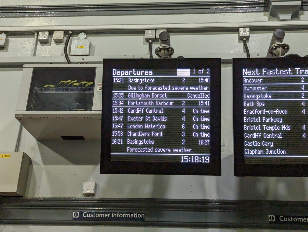 12:59:34 Finally at Shaftesbury… Which proved to not be a very useful place to end the walk! I was planning to get a bus from there to Gillingham, but it seemed the next few trains from Gillingham were cancelled. | 14:39:47 …so instead I got a bus back to Salisbury, and as I had a bit of a wait for the next train from there to London I decided to poke my nose in at the Haunch of Venison. | 14:43:00 Which was rather lovely. | 15:18:21 I was perplexed by trains being cancelled due to *forecasted* bad weather. |