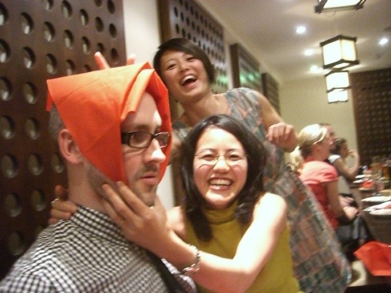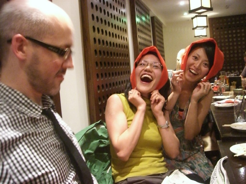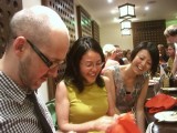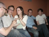 | 22:27:44 The masu (wooden sake cups) were a popular feature of the evening. Presumably Chie is demonstrating a Japanese custom here. | 23:13:11 Now in Karaoke Box, and the singing has clearly begun already. | 23:17:30 Kyle and friends, don't remember what the song was though. |
