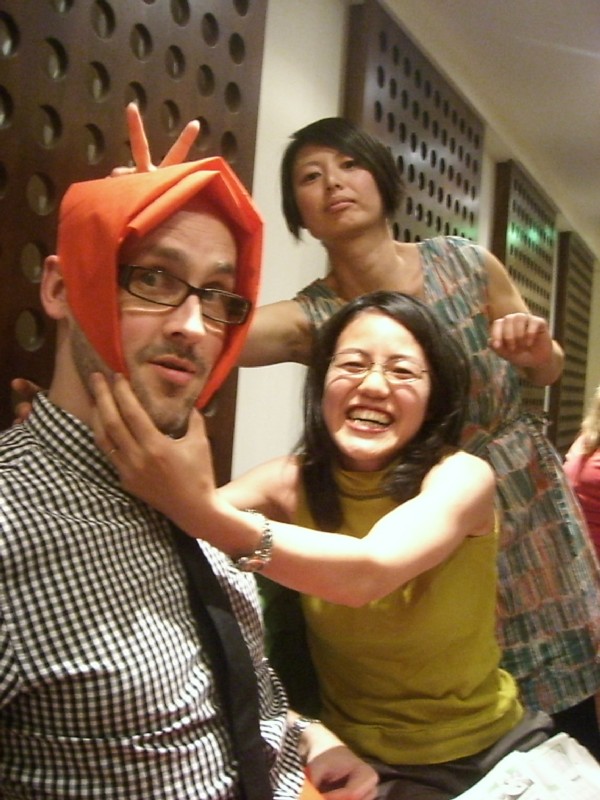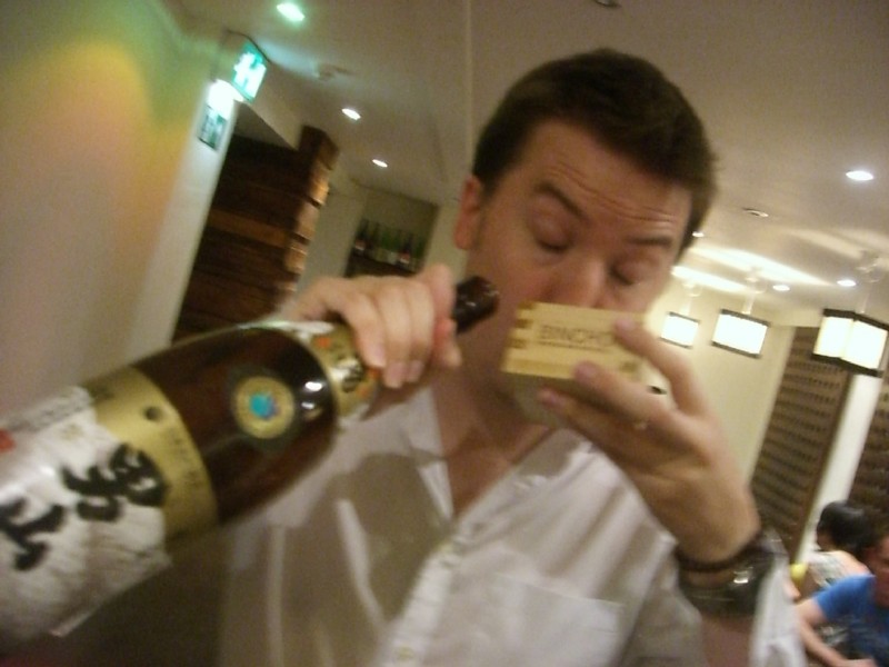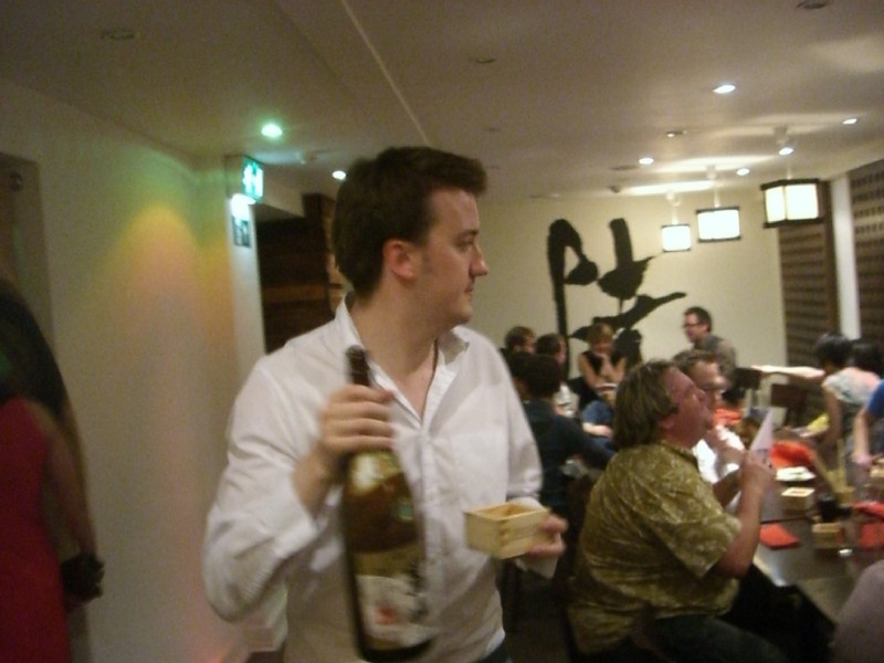 | 22:24:11 Me and one of the large bottles of sake. | 22:24:16 Not sure we quite got the timing right here... | 22:24:35 ....that's better. I think Leon was in charge of the camera, I rather like the composition here. Nice work Leon! |