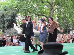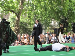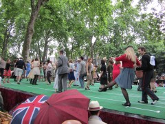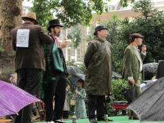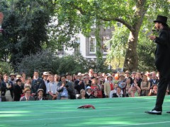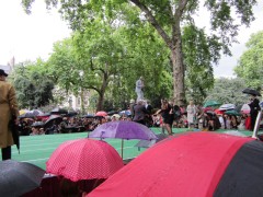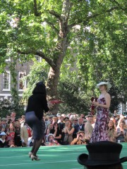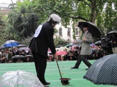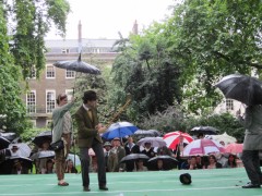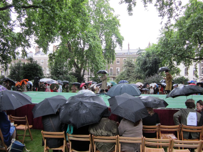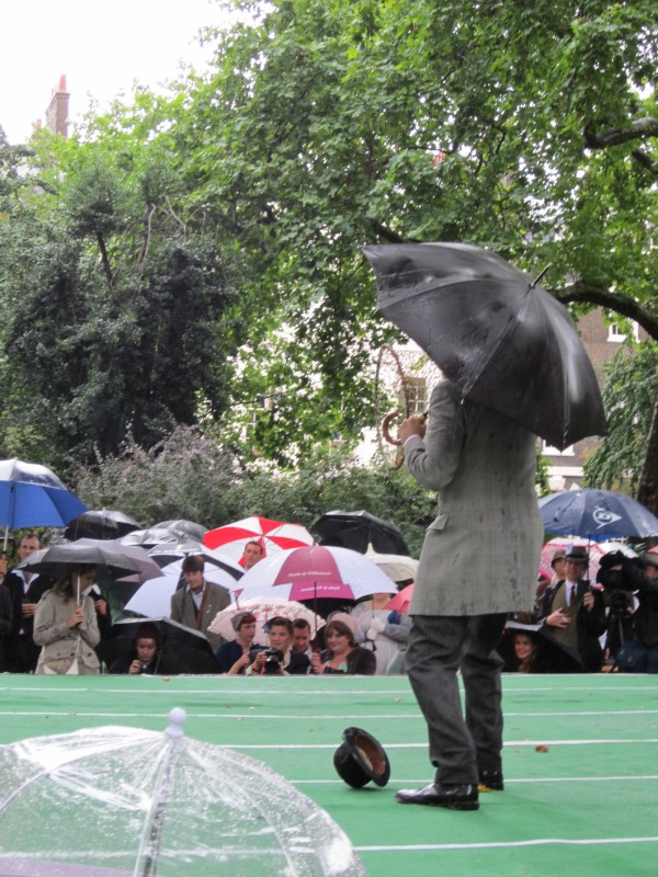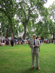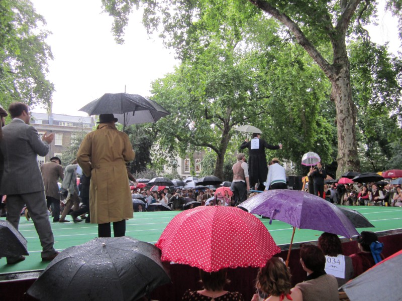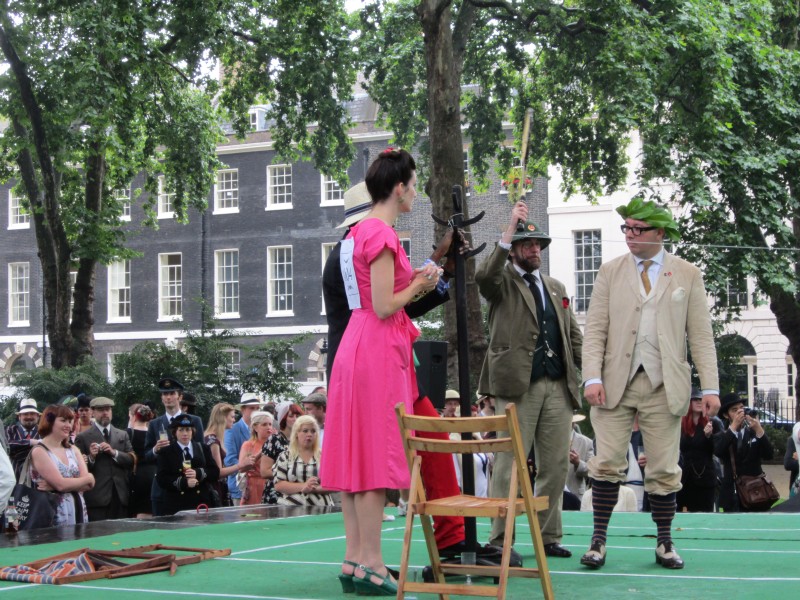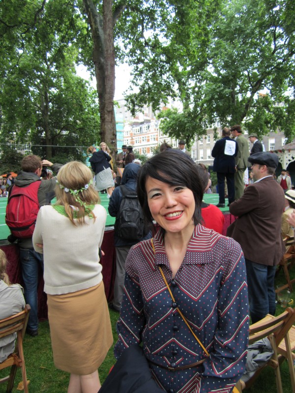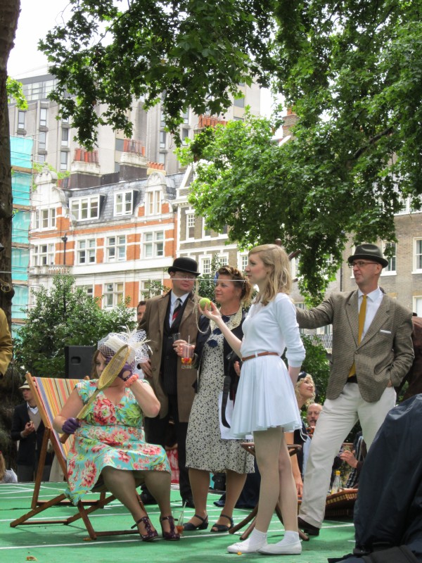13:59:19 Bedford Square gardens made for a very pleasant venue despite the rain. | 13:59:36 Me in my "Man from Del Monte" outfit. | 14:06:12 Chie having some cake. | 14:26:17 This is the not playing tennis event now, where the participants have to be as disinterested as possible in actually playing tennis. |