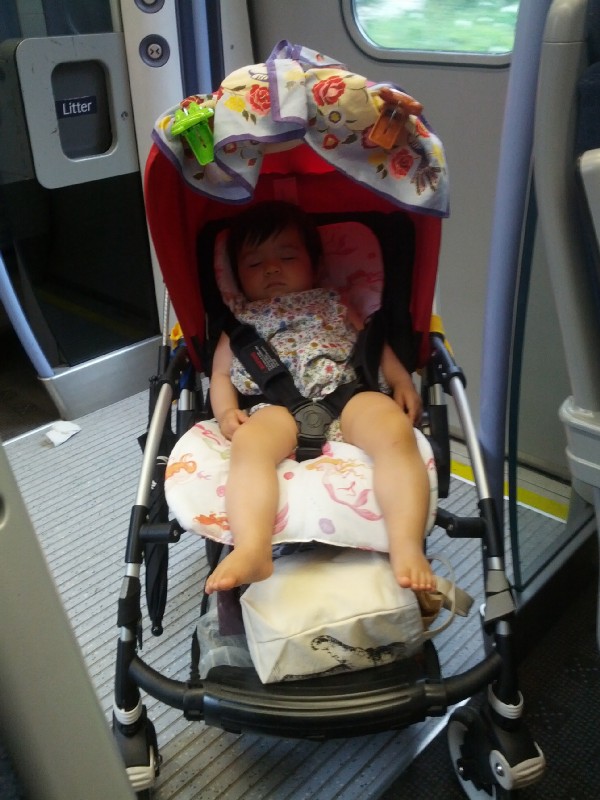 Erika asleep in her buggy on the train home.