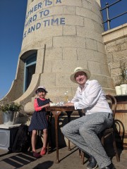 16:21:50 Me and Erika in the Smokehouse, the fish and chop shop where we usually go after the beach. The suncream and hot weather has made my face look a bit weird. | 17:07:45 Walking along the Harbour Arm for a quick visit to the Lighthouse. | 17:07:49 | 17:10:59 Approaching the Lighthouse. |