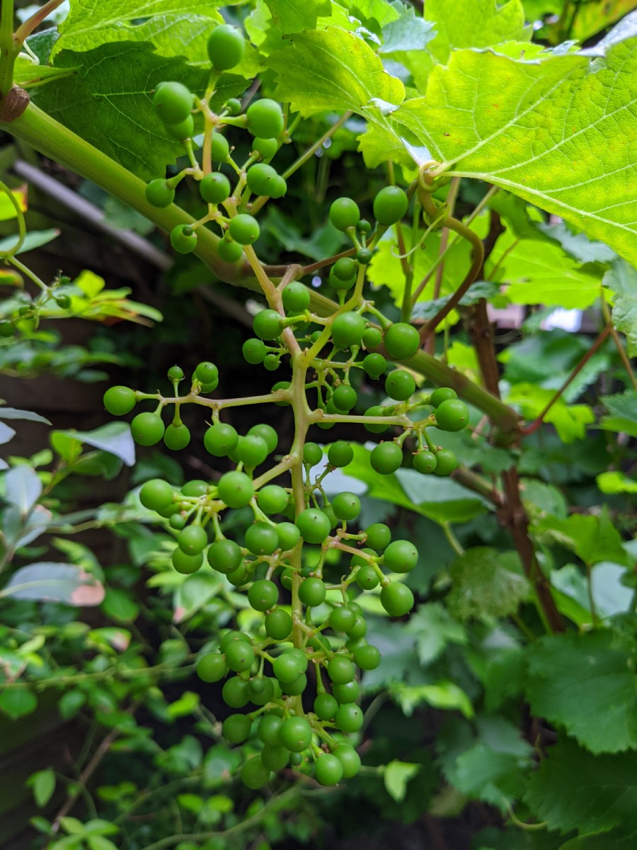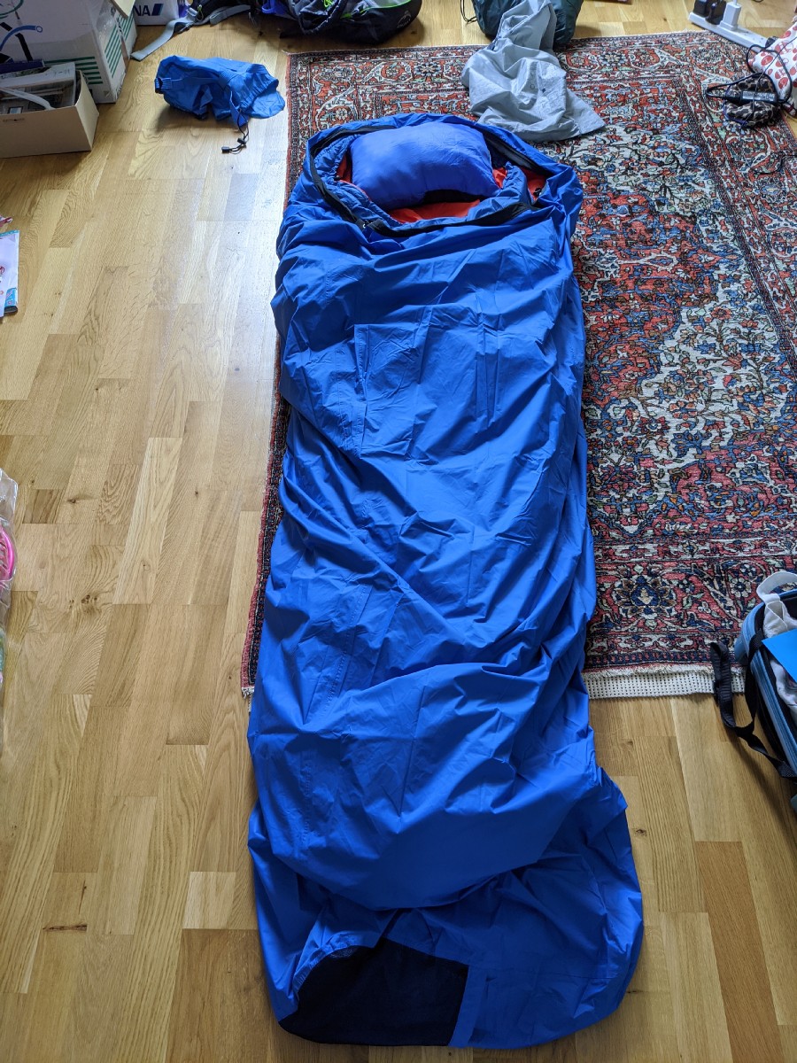 14:32:50 Various camping paraphernalia and supplies which arrived today. | 14:33:10 Best of all though, my titanium spork. | 15:32:42 My sleeping bag and sleeping pad (the Thermarest) inside a bivvi bag. The bivvi bag is a kind of waterproof outerlayer for a sleeping bag, allowing you to sleep directly outdoors without a tent. | 18:25:02 Checking the grapes in the garden. |