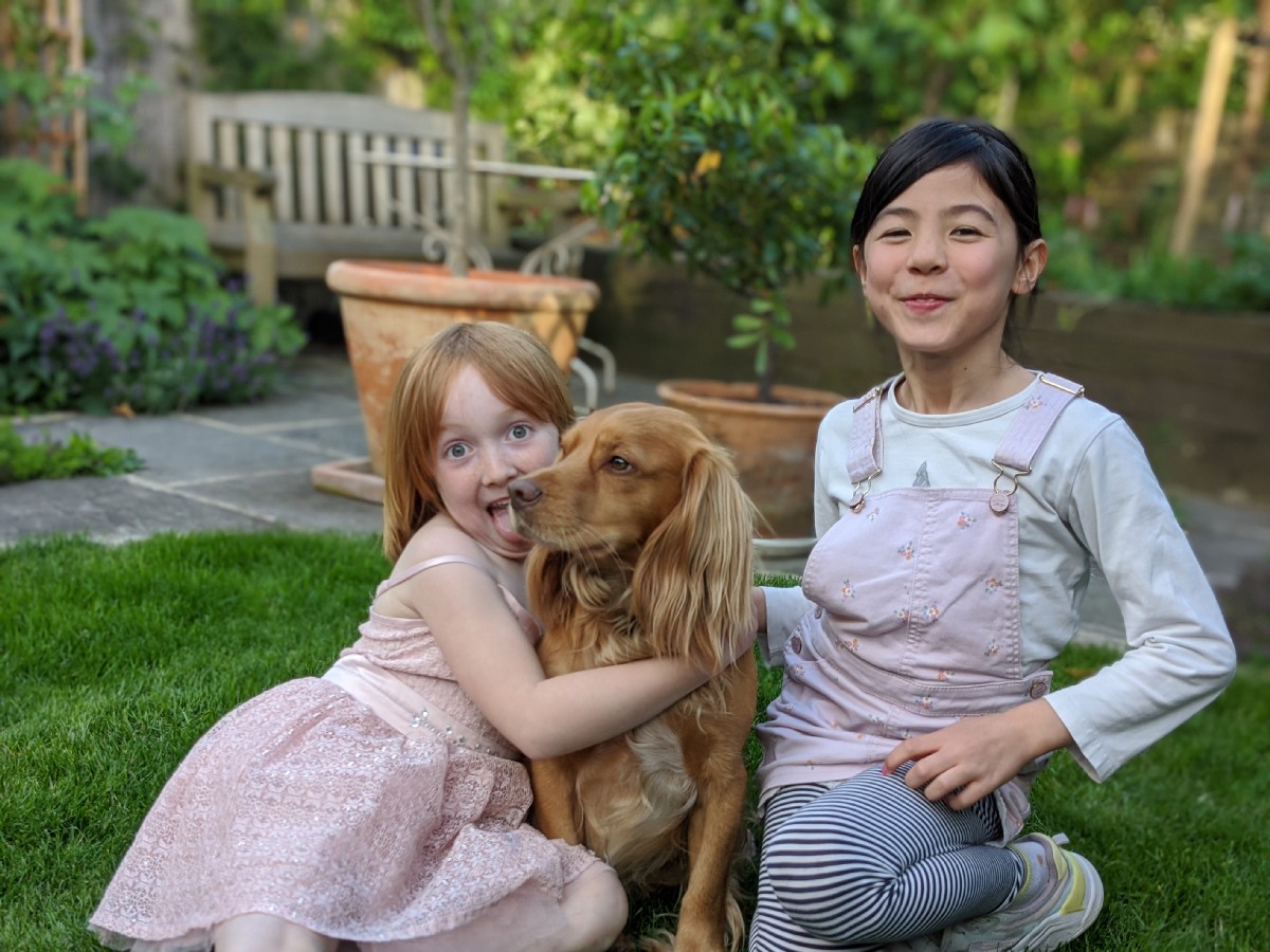 18:01:32 I took another bottle from the Vineyards of Hampshire case to our friends house for our evening picnic. This time the Raimes English Sparkling. This was very nice I though, and suited the occasion well. | 19:24:12 Erika and our friends' dog. | 19:24:31 The girls and the dog. | 20:47:09 Some of Jeremy's art still on display. |