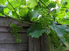 13:00:05 The folding windshield arranged around my campstove with the billy can on it. | 18:36:51 Some GevCham Christian had kindly given me about a year and a half ago. It was in really good shape now - lovely violet fragrance. | 19:55:32 Quite rainy out today! | 19:56:42 Checking the grapes. |