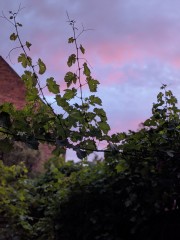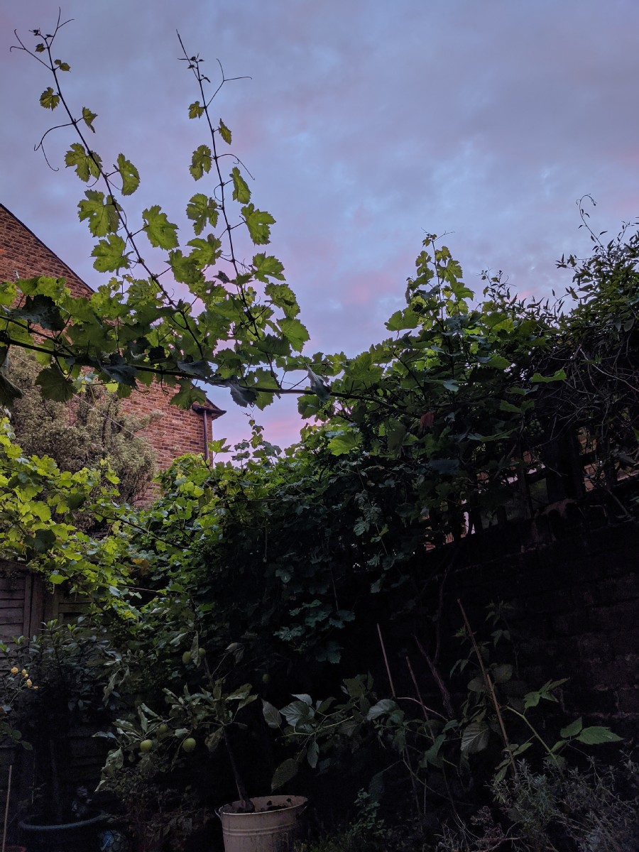 20:30:34 Some Davenport Pinot Noir and Francis Pryor's book about Stonehenge. | 20:44:07 The cork from the Davenport disintegrated a bit as I was taking it out. | 20:55:32 The vines and some increasingly pinkish sky. | 20:56:00 |