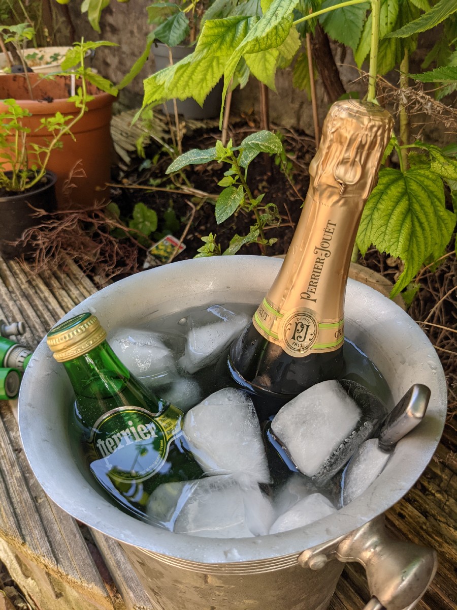 15:17:15 I love this photo! | 16:42:23 Getting very Hawaiian in the back garden! I had to put up a tarp for a bit of shade. | 16:42:48 I thought I'd try French sparkling wine for a change - this was a present from Chie some time ago, and had been languishing in the cellar. Also found it pleasing to have both Perrier and Perrier Jouet in the same ice bucket. | 17:06:16 Cheers. |