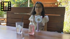 12:47:15 Erika in the Pineapple, cooling herself down with a portable fan. | 12:47:39 Slow motion video of Erika's hair being blown by the fan. | 12:48:16 ...and another one. | 12:54:19 Erika sipping her drink. |