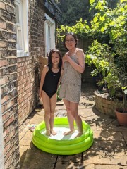 13:11:45 Chie and Erika playing Uno while waiting for lunch. | 13:19:26 The three of us at our table once lunch had arrived. | 14:10:25 I went and bought a hose to help fill up the paddling pool. | 15:02:21 The girls cooling off in the paddling pool. |