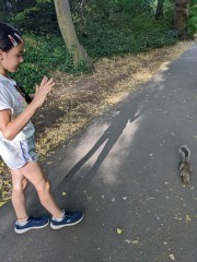 12:44:04 Before going to the party, I attempted to let out a pair of trousers. More out of academic curiosity about how one does this than any expectation the end result would be usable. Unfortunately the material has discoloured a bit so it's very obvious to see where they've been let out. | 16:11:05 The only photo I took at Christian's birthday. of the birthday cakes. | 18:27:27 Erika on the way back from the party, being followed by a squirrel. | 18:27:31 |