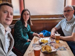 09:59:50 Lucy and Martin in the queue for the Regency Cafe. | 10:48:55 The three of us with our breakfasts. | 10:48:59 | 12:03:40 Later on I organised an impromptu tour of London for Lucy and Martin including a pint at the French House in Soho. |