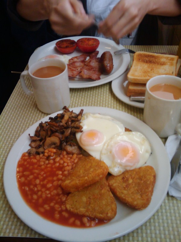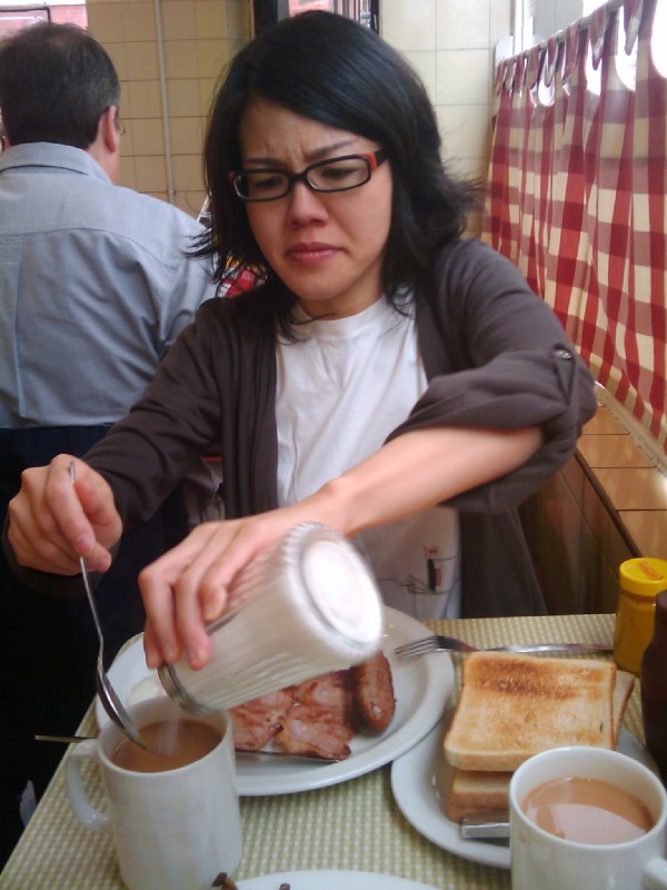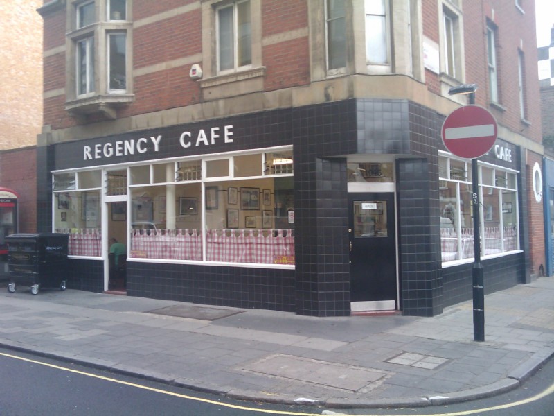 | 10:41:21 Chie sugaring the fabulously strong tea at the Regency. | 10:41:28 This really was on of the best vegetarian English breakfasts I've ever had - hidden under those fried eggs is some bubble and squeak, quite delicious. | 11:02:01 The Regency Café from the outside. |