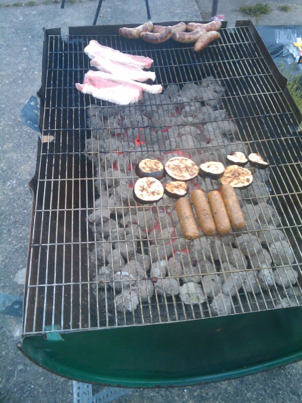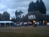 | 18:20:24 The cricket pavilion in East Malling which was to be the venue for this Michelle's birthday party. | 19:36:13 Out in the field, the beginnings of a reconstruction of stone henge, built from apple crates. | 20:23:27 The barbecue! |